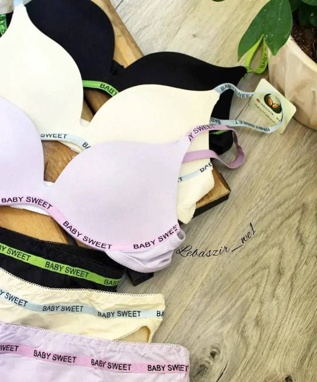 این ستهای لباس زیر زنانه با طرح "BABY SWEET" (قابل مشاهده در تصویر) در رنگها و سایزهای متنوع موجود هستند. کاپ و شورت این ستها با نوارهای کشی رنگی تزئین شدهاند و در رنگهای اصلی کرمی، صورتی، مشکی و بنفش با جزئیات نوارهای رنگی (صورتی کمرنگ، آبی کمرنگ، صورتی و سبز) عرضه میشوند. سایزبندی این مدل برای کاپهای ۶۰ تا ۸۵ مناسب است؛ به طوری که سایز لارج معمولاً برای ۶۵ تا ۸۰-۷۵ و سایز ایکس لارج (XL) برای ۷۵ تا ۸۵ اندازهگیری شده است و تنوع کافی برای پوشش سایزهای مختلف وجود دارد.